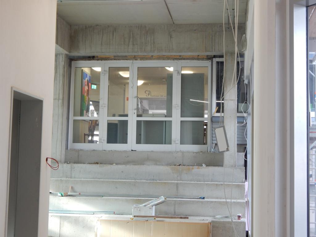 Im Moment werden im Inneren die Decken abgehängt, so dass die Gebäude- und Versorgungstechnik später nicht mehr sichtbar sind. Im Außenbereich finden die Vorarbeiten für das Pflastern des Schulhofes statt. Dafür muss vermutlich noch eine Menge Material zum Anheben des Bodenniveaus hergekarrt werden.